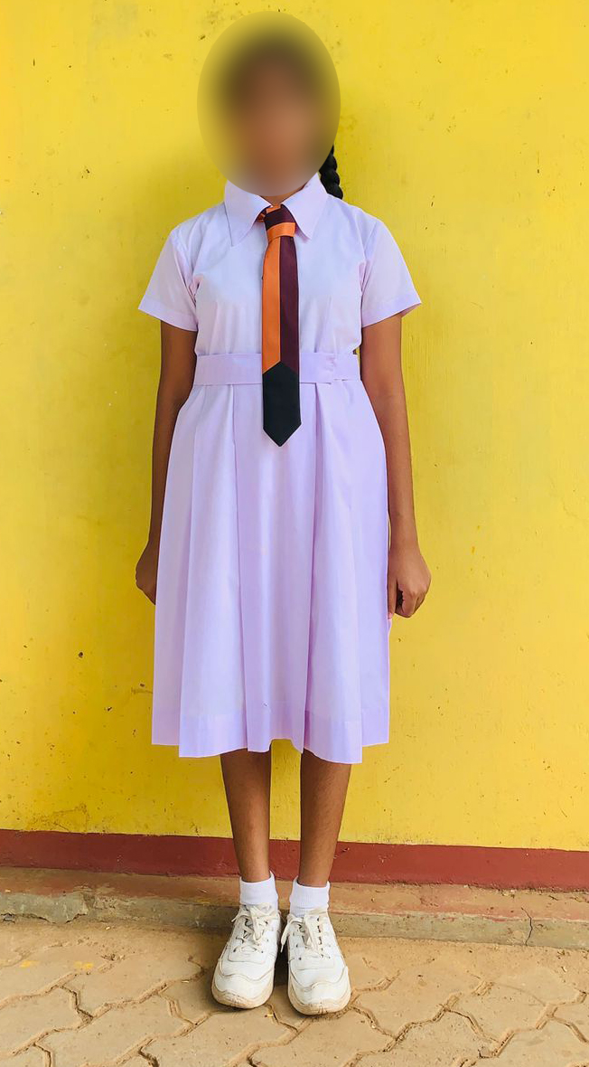 දණහිස වසන පරිදි දිගින් යුක්ත විය යුතුය. ගවුම යට වාටිය අඟල් දෙකස් අමතරව තිබිය යුතුය.එක් පැත්තට අඟල් එක් රැෆි 8 ක් විය යුතුය. ගවම් ඉදිරි පස ඉහල විවරය අගල් 6ක් පහලට තබා බොත්තම් මදකක් අල්ලා තිබිය යුතුය.ගවුමේ හැට්ටය ඇඟට තද නොවන සේ මසා සිබිය යුතුය.ගවුමෙ අත දිගින් උරහිස හා වැල්මිට අතර හරි මැද ප්රමානයට දික් විය යුතුය. ග්වුමේ වීම පස පාසලේ නිළ බැජ් එක සහිත සාක්කුව අල්ලා තිබිය යුතුය. ගවුමේ ඉන අත පහසට දිගහැරිය විට වැලැව්වේ ප්රමාණයට විය යුතුය.